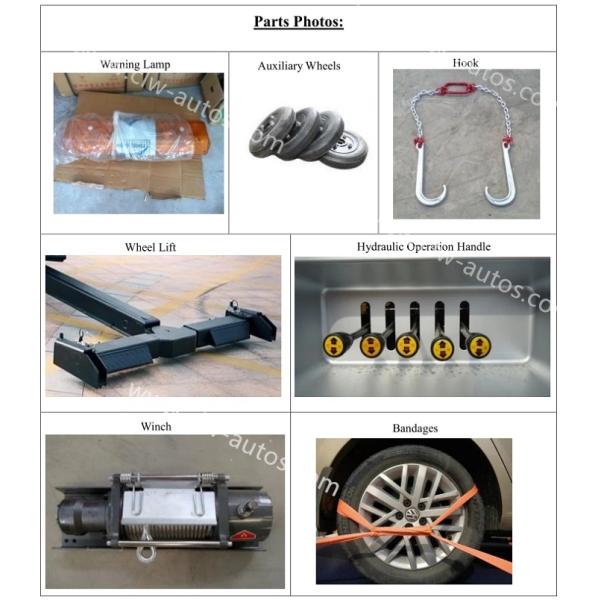 | Remarks | 1. Equiped with One Set of Auxiliary Wheels 2. Bandages 4pcs 3. Yellow Warning Lamp 1pc 4. Double Side Hydraulic Operation 5. Can Tow 2 Cars | ||